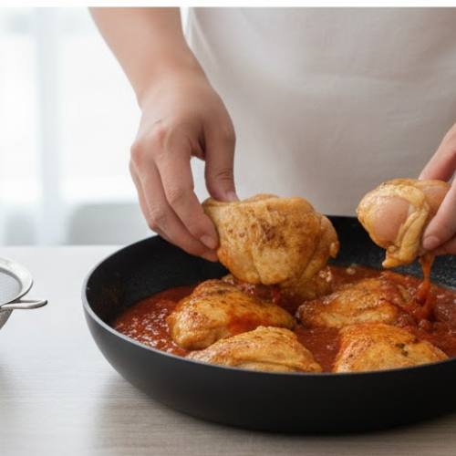Add the seared chicken back into the skillet, mixing it into the sauce. Cover the pan and let it simmer for about 5 minutes, allowing the chicken to soak up the flavors.