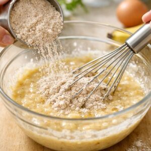 - This is where many home cooks stumble. Instead of dumping all the flour in at once, sprinkle it gradually while whisking continuously. I typically add the flour in four additions, whisking for about 10-15 seconds between each addition. This prevents the lumps that form when wet ingredients suddenly meet a large amount of dry flour. The whisking motion is gentle—I’m not trying to develop gluten like I would with bread dough. I’m just incorporating the flour until I see no visible streaks of white flour remaining. A few tiny lumps are actually fine and will smooth out as the batter rests. Stop whisking once the batter reaches a consistency similar to thick yogurt. Here’s a professional secret: let the batter rest for 5 minutes before cooking. This allows the whole wheat flour to fully hydrate, which creates more tender pancakes and gives the ingredients time to truly meld together.