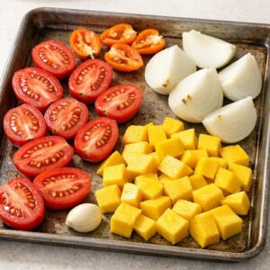I’ve arranged these in a way that makes sense for the roasting process first, then the finishing touches. One note before we dive in: the beauty of this recipe is that it’s forgiving. If your mango is slightly underripe, the roasting mellows any tartness. If your tomatoes are especially juicy, the oven helps concentrate their flavor instead of creating excess liquid.