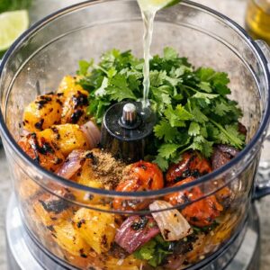 - Transfer all your roasted ingredients to a food processor or high-speed blender. Add your lime juice, the optional cumin, and most of your cilantro (save a small handful for garnish, which sounds fancy but honestly just makes it look beautiful). Pulse or blend until you reach your preferred consistency. I like mine slightly chunky—you can still see pieces of mango and tomato—rather than completely smooth. This gives the salsa texture and makes it more visually appealing. If you prefer silkier texture, blend longer. If you like it chunkier, pulse fewer times. Taste as you go. Add your salt gradually, tasting between additions, until it hits that perfect balance where the sweetness of the mango and the heat of the habanero are both prominent but neither overwhelms the other.