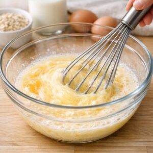 Once your eggs are well-beaten, slowly pour in your almond milk while continuing to whisk. The goal is a completely smooth, homogeneous liquid with no streaks of egg white visible. This step takes about 1-2 minutes of continuous whisking. I listen for the change in sound—when it transitions from thick to liquid and back to slightly thickened, I know the eggs have fully incorporated.