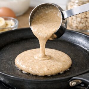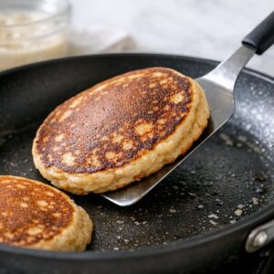 Using a ¼ cup measuring cup or a small ladle, pour your batter directly onto the hot surface. Each pancake will be about 3 inches in diameter—manageable to flip and close enough together that they share warmth without touching. I usually fit 3-4 pancakes on a standard 10-inch skillet at once.